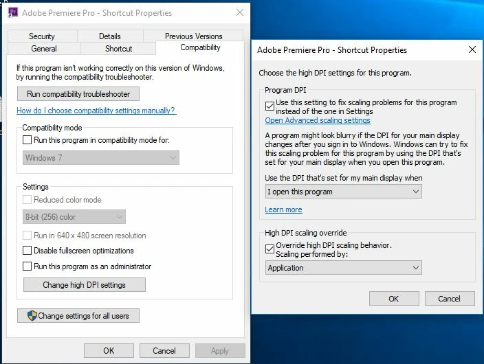 choose the compatibility tab and select "Change high dpi settings" under the settings section,