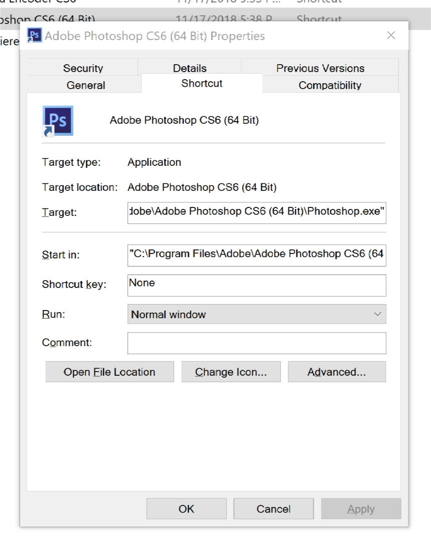1. Right-click the shortcut for Photoshop and click Properties.
