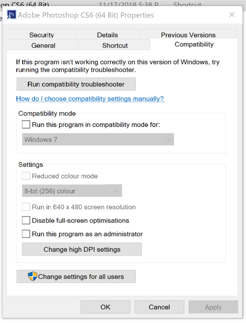 You therefore also have to perform the above steps for the PhotoShop .EXE file.  On my computer, this is located at: C:\Program Files\Adobe\Adobe Photoshop CS6 (64 Bit)