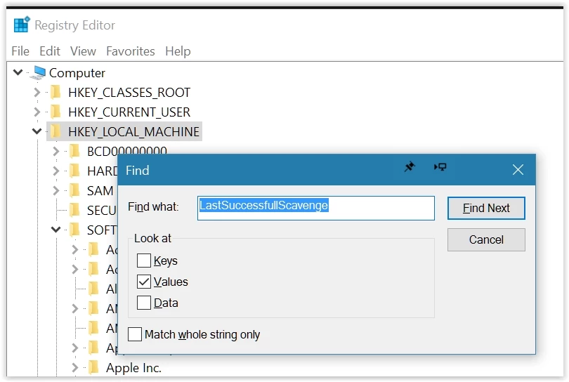 • Type in, "LastSuccessfullScavenge" (this is one of the other values in the location that we want to find);