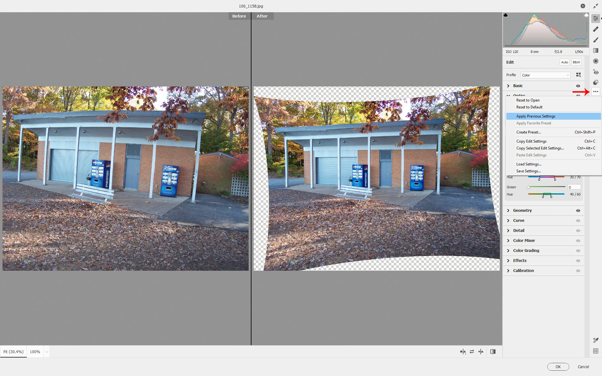 You could also try Apply Previous Setting from the More image settings menu as long as you didn't use the camera raw filter on another image.