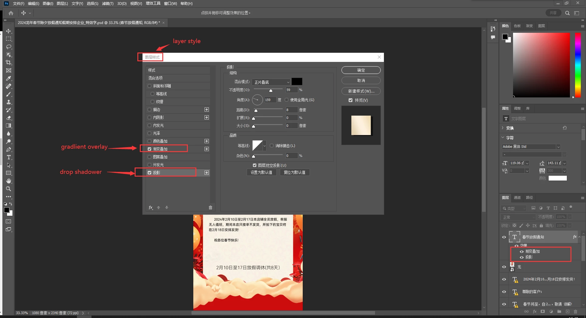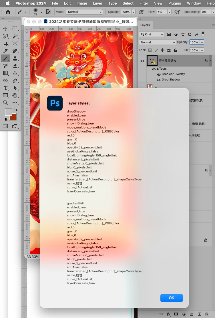 There are two styles applied to the layer below, gradient overlay and drop shadow. How to get the name and specific setting value?