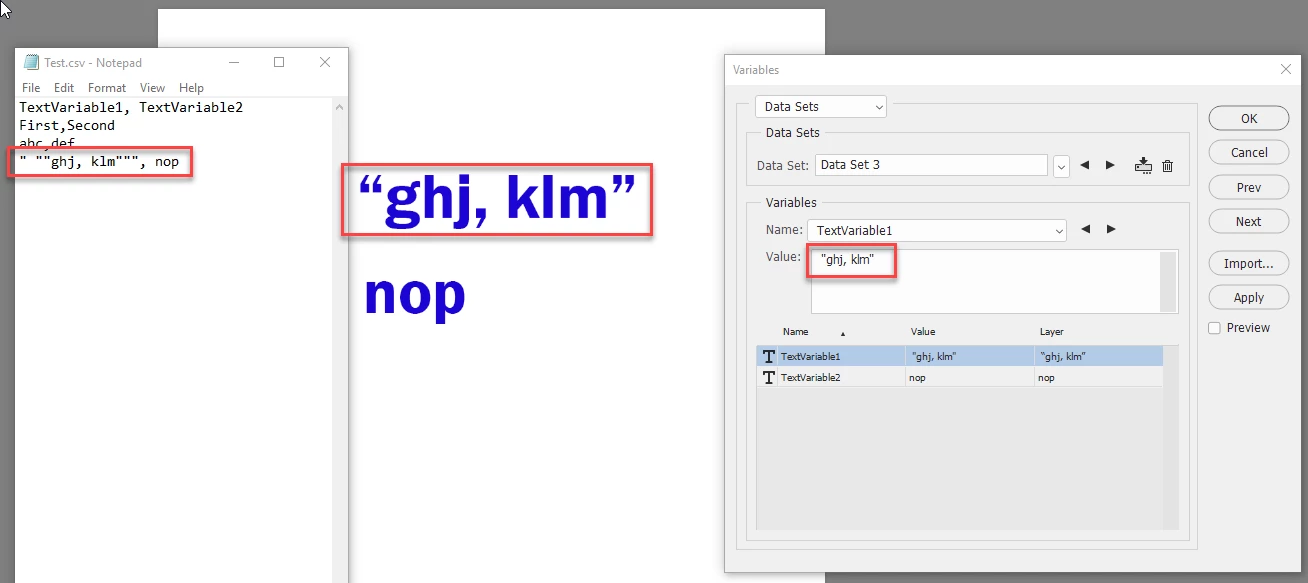 I am successfully using the Data Set to import a csv or tab document and generate the sequence of items in my list. I managed to use the double quotes to get them around my quote text. "It works!" she said