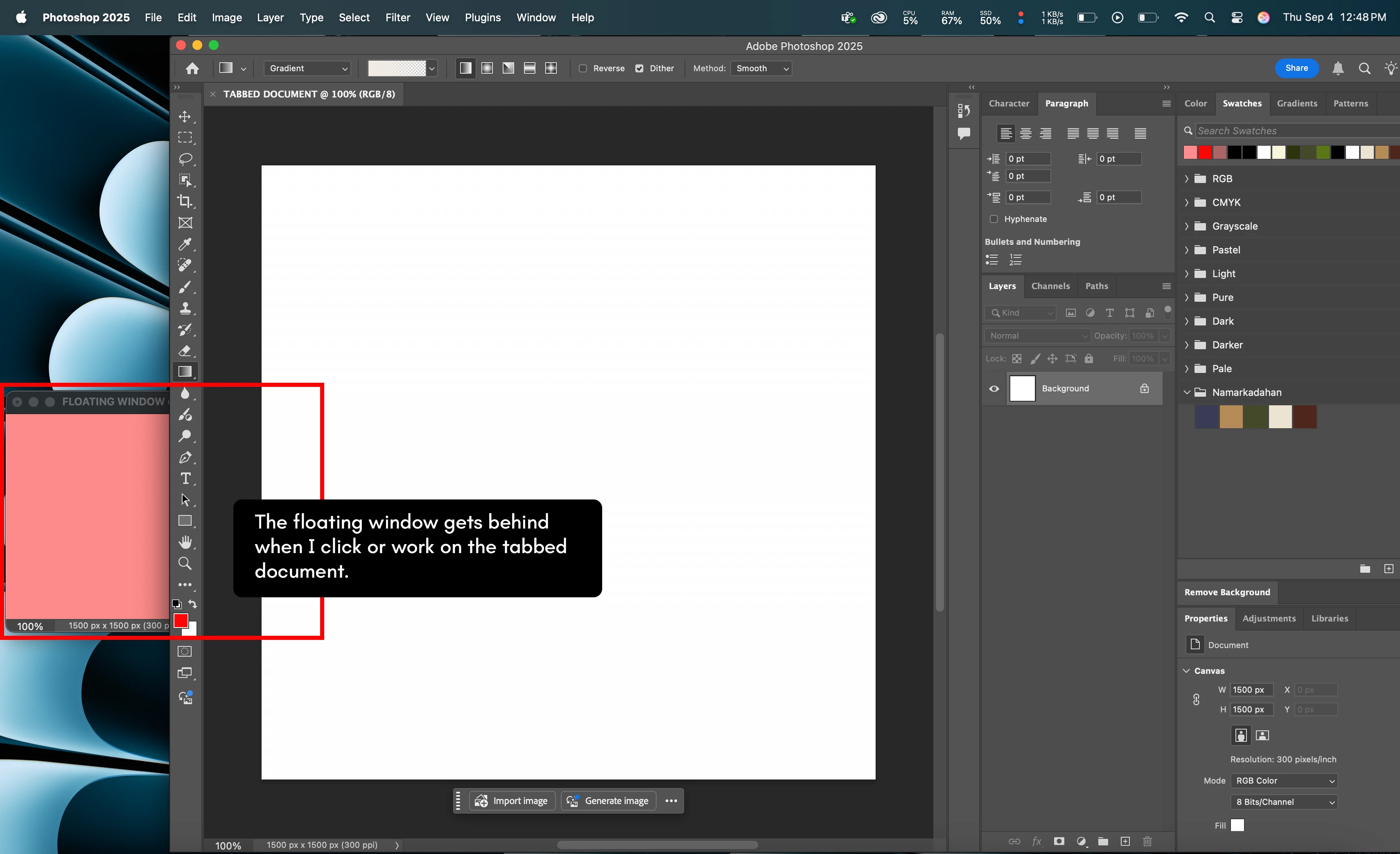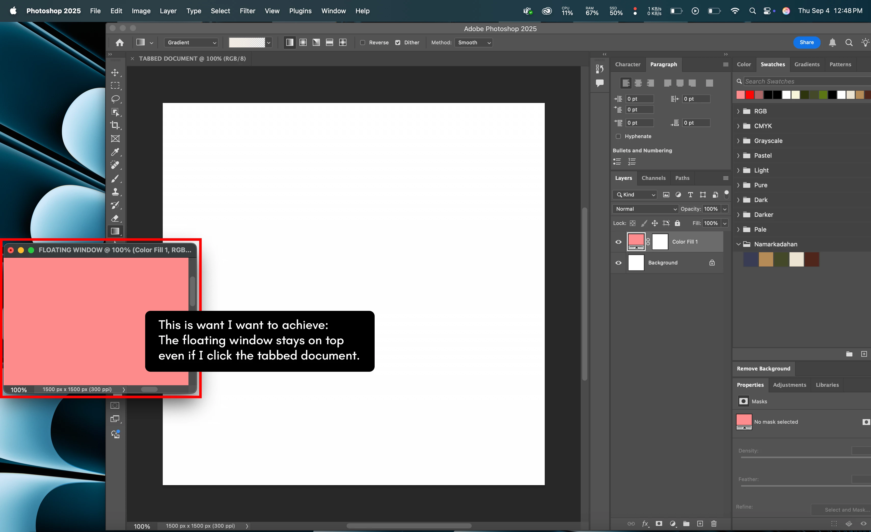 I just switch to macOS (current version: Sequoia 15.6.1) from Windows and encountered this issue. Whenever I drag a document to be a floating window, it gets behind a tabbed document. Now, I can't work on fullscreen because I have to manually drag photoshop everytime I want to see or work on the floating document/window. This is not an issue on Windows OS because the floating windows always stays on top.