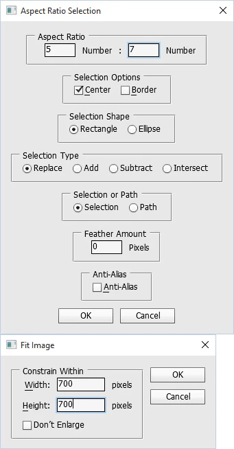 step 1 menu File>Automate>AspectRatioSelection... In its dialog set 5 7 center rectangle replace selection 0 feather