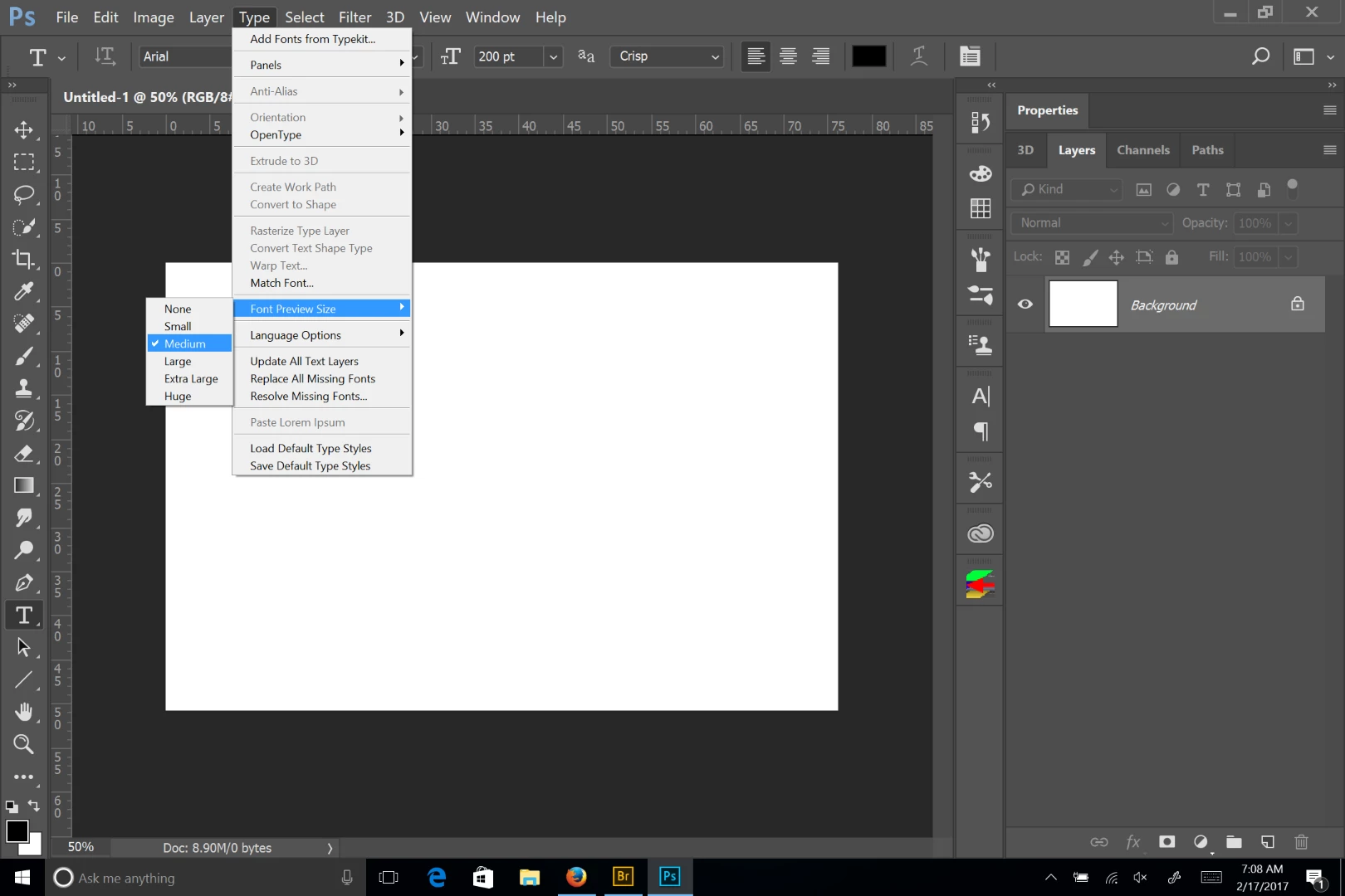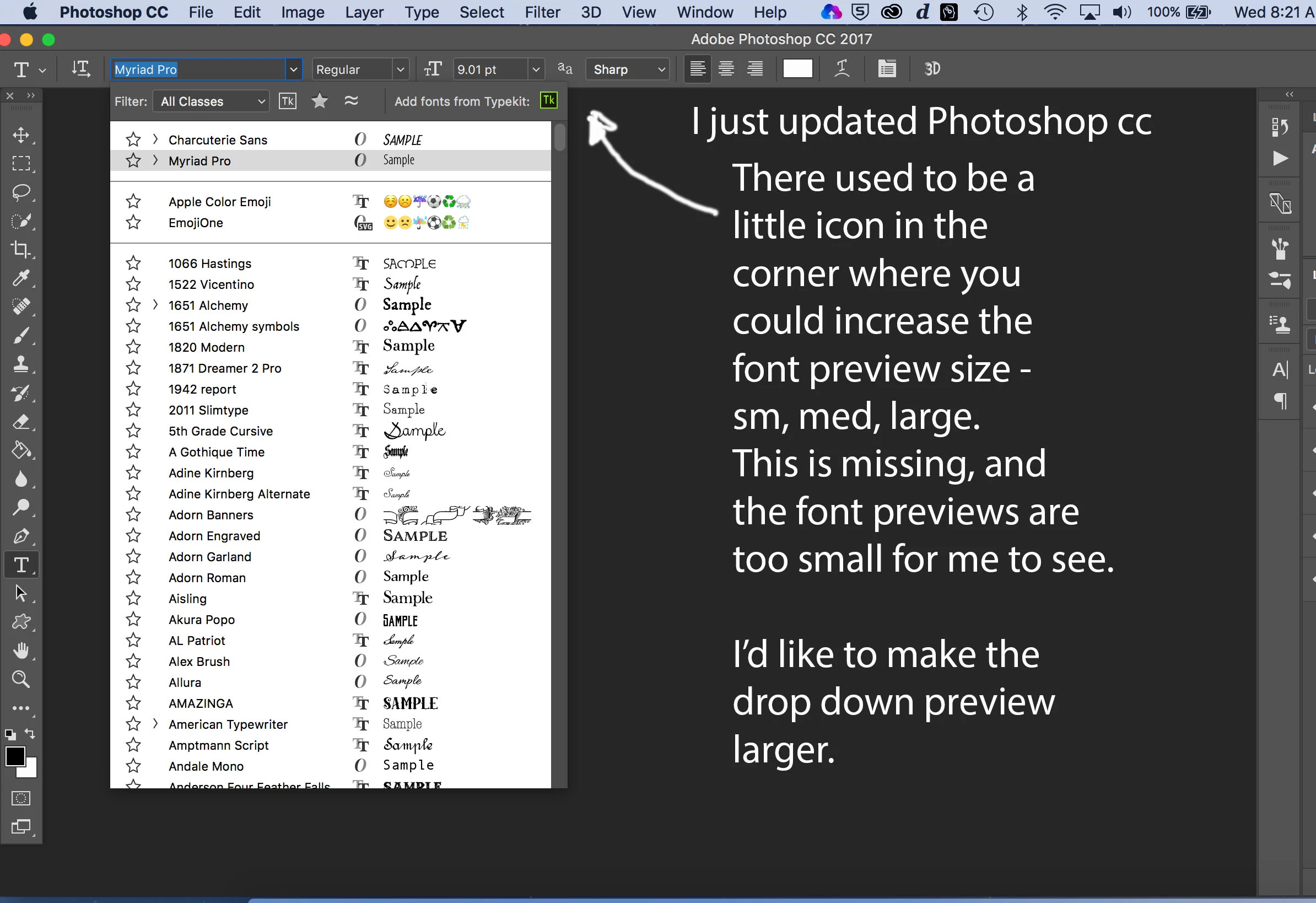 I just updated Photoshop CC and need to make the font preview size larger. I have bad vision and can't see easily. There used to be a drop down on the upper right side of the preview box that would let you select small, med, large....but that seems to have disappeared with this latest update. Is there a fix for this? I'm using a magnifying glass to see the previews now.![]()