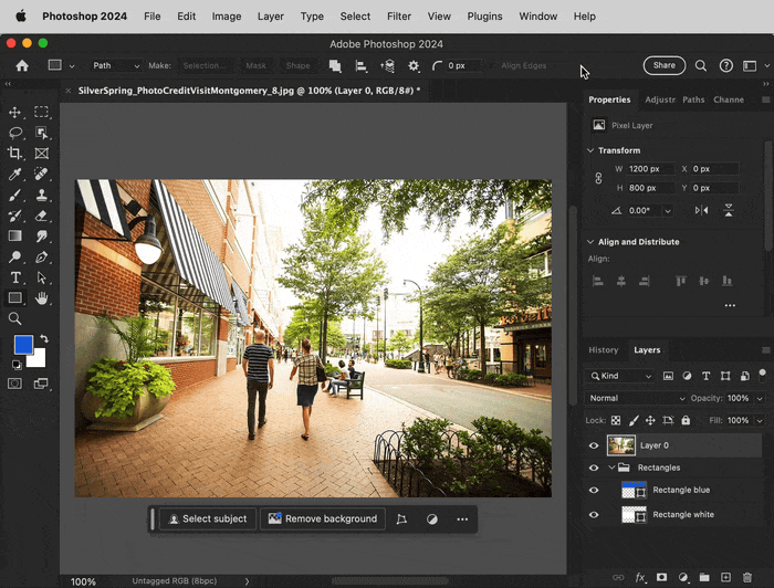 1. Draw the two rectangles as vector shape layers, and stack them behind the image layer. I grouped the rectangles, but you don’t have to.