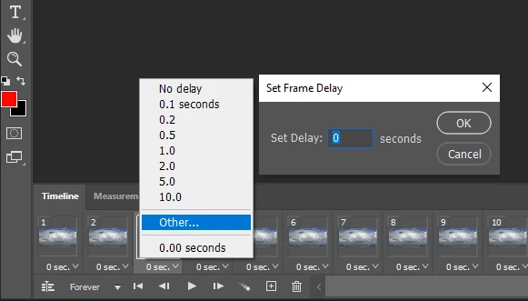 In A Frame Animation Timeline you can set any delay value for a frame delay per frame.  Video Timeline no.