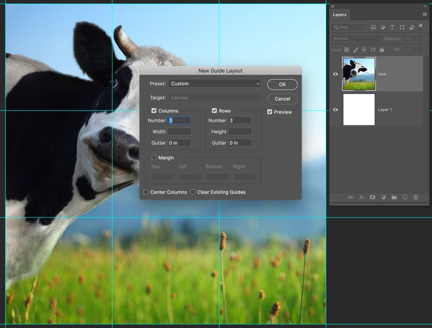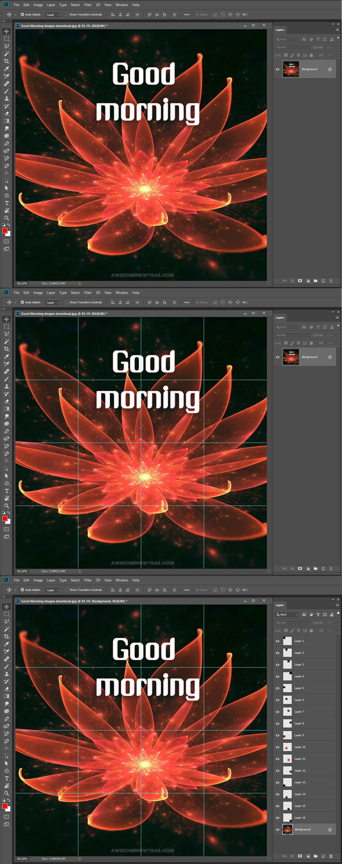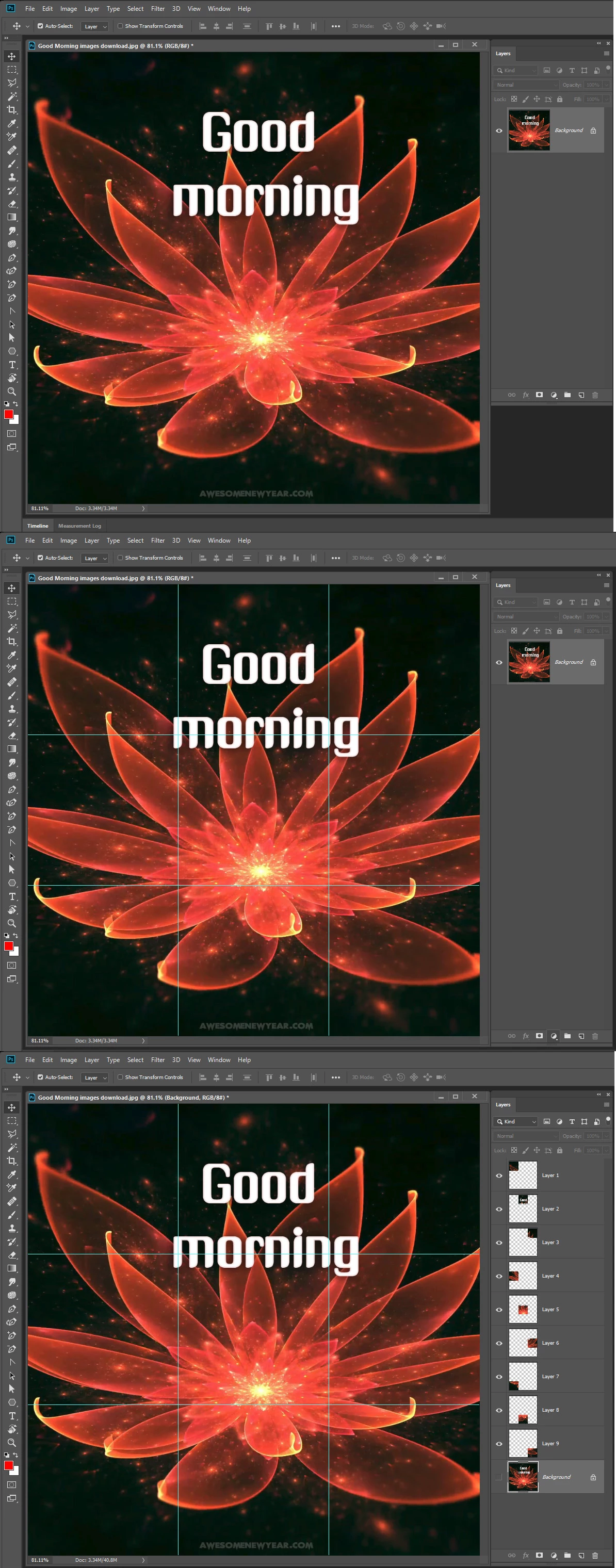 From there you can select each square, jump it to a new layer (Ctrl/Cmd J), and the export each layer as a jpg or png. Post in groups of three from the bottom, up.