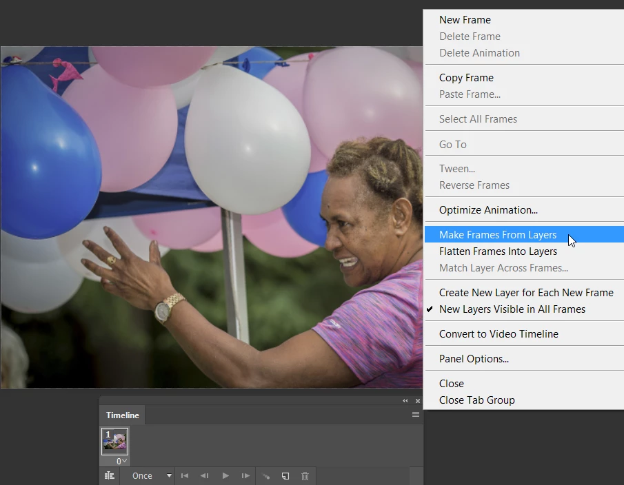 Switch to the Motion workspace, and from the timeline chose Create Frame Animation