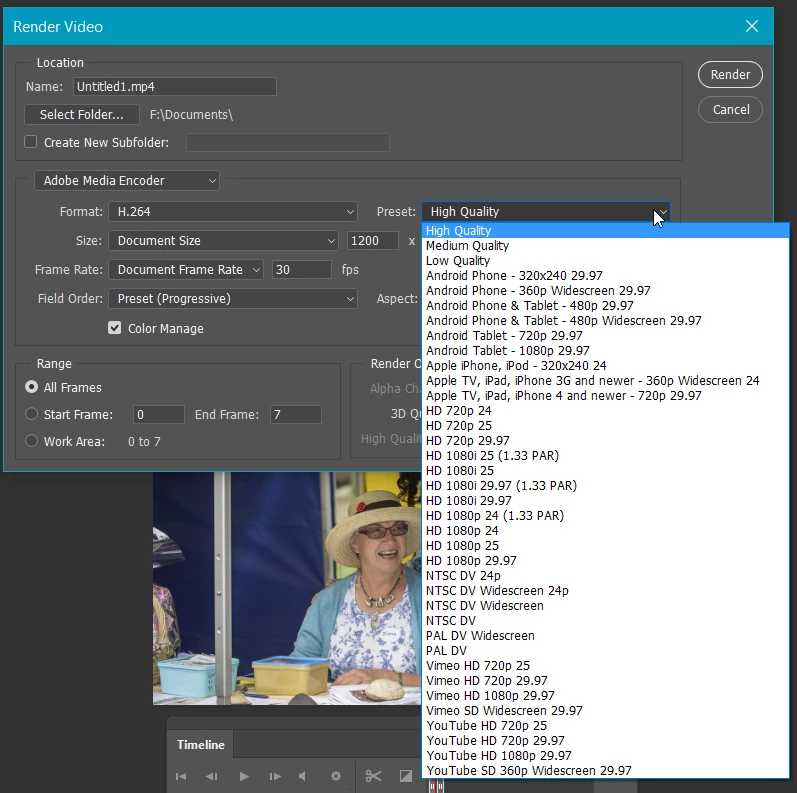 I just used a few JPG files I had handy, but you'll probably use H.264, and choose a preset from the extensive drop down list.