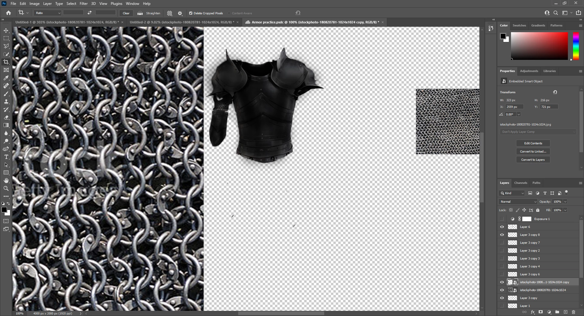 There have been several posts on this, however none of them have ultimately helped me. First, I am about 1 day old in photoshop but have goals to learn how to composite photos. My problem comes when I am trying to combine photos, for example, I've been trying to create a knight, however, when bringing in picture of chain mail and scaling it down for 1 piece of the arm, the chain mail becomes significantly pixilated.