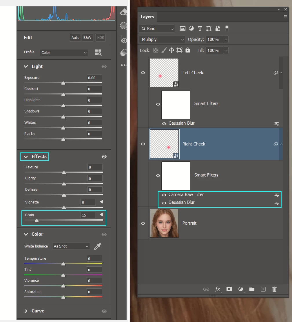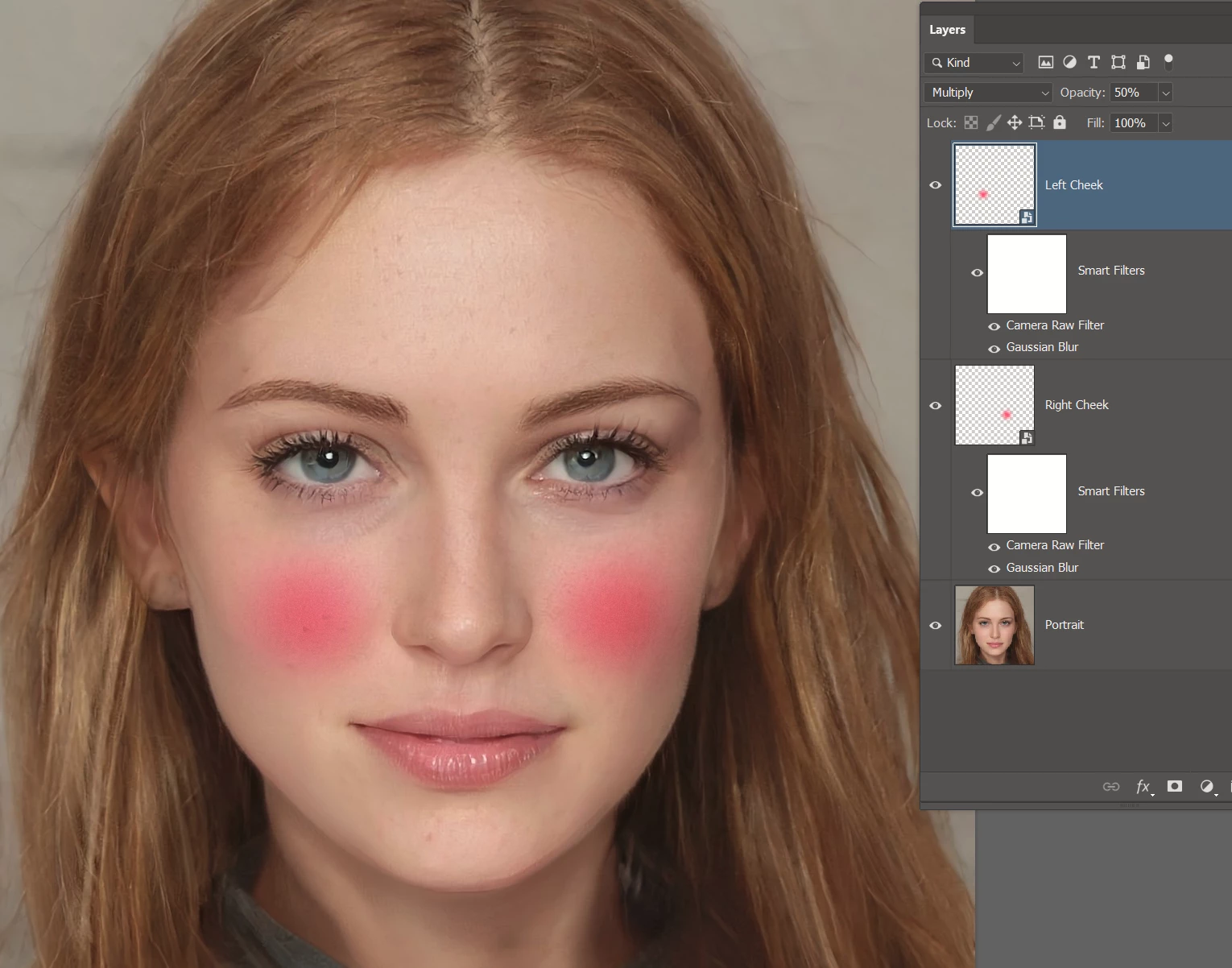 I'm looking to add a natural-looking blush to a face using Photoshop, but I'm not sure about the best techniques or tools to use for this. Could you provide a detailed guide or step-by-step instructions on how to achieve this effect? Specifically, I'm interested in knowing which brushes, layers, and settings work best for creating a realistic blush. Any tips on blending and color selection would also be greatly appreciated.