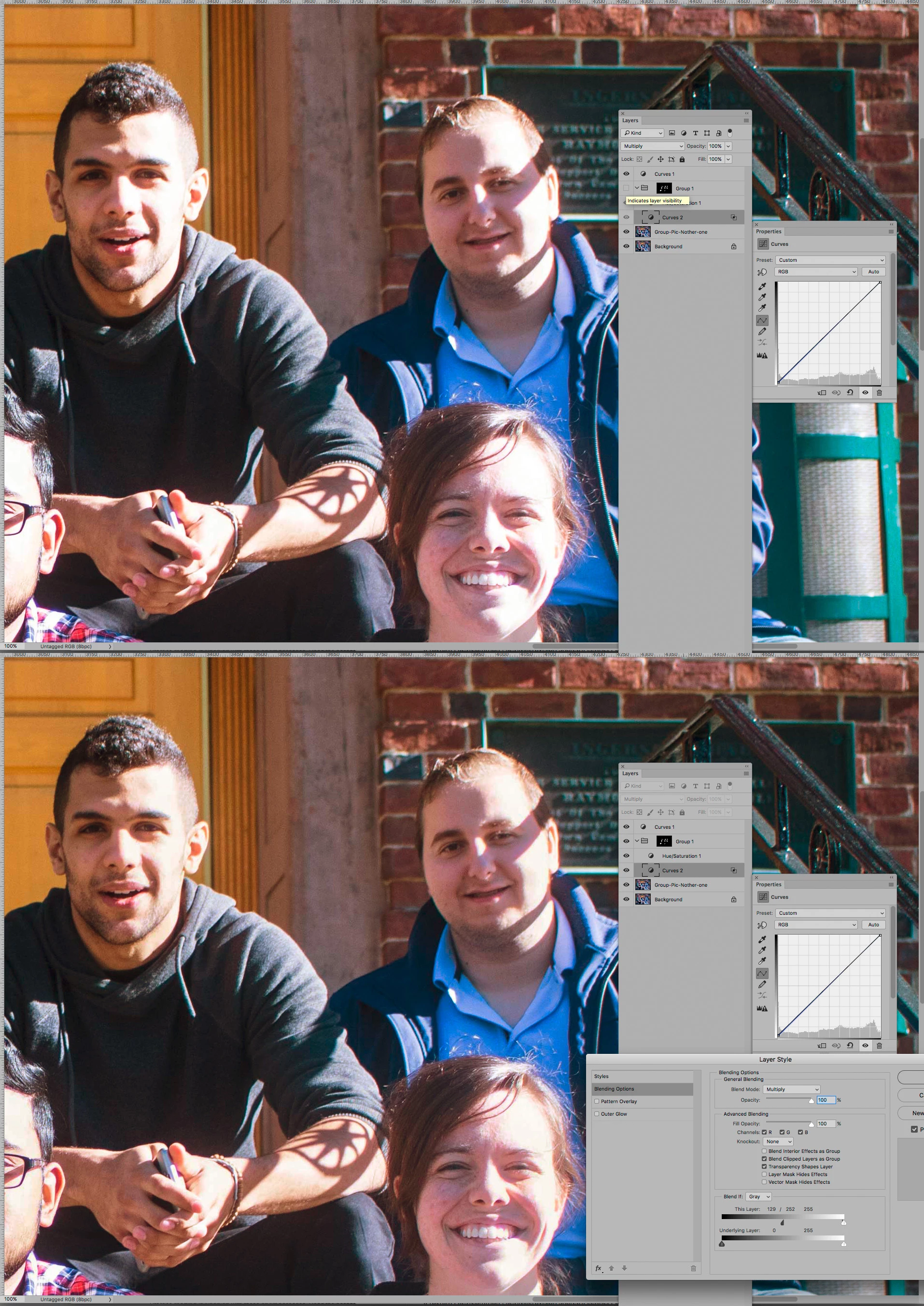 I want to remove just the bright spots on their faces without killing the brightness of the picture. If I have to edit each face I will do it, but so far the results have been pretty destructive and not subtle. If someone could fix this and show the steps it would be a life savior. Any help is appreciated!