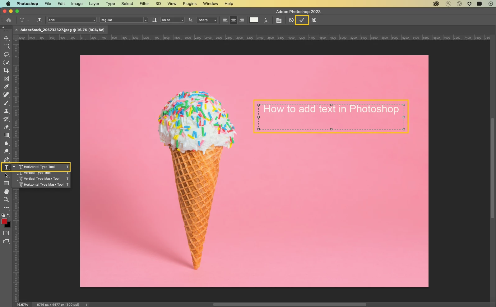 Create or open a document and select the Type Tool from the toolbar on the left. Then tell them how to select the font and color. After entering your text, click the checkmark in the Options bar to accept it.