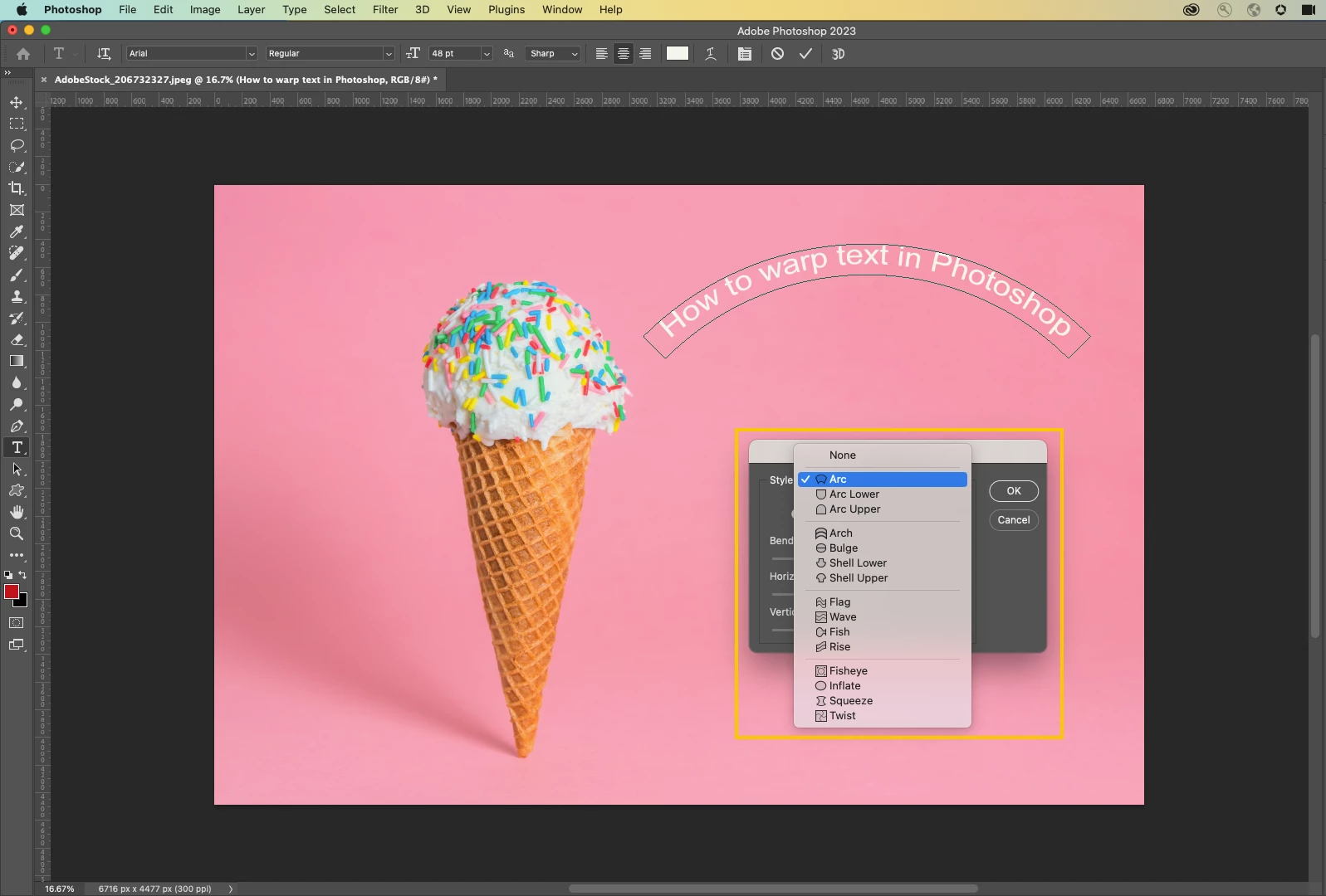 in the Options Bar. This will open Photoshop's Warp Text dialog box, where you can choose (from the 15 preset options) the style of warp warping you want to apply. Photoshop refers to the various warping options as styles, but by default, the Style option at the very top of the dialog box is set to None. We've chosen 'Arc' here. As soon as you select a style, Photoshop applies it to the text in the document, giving an instant preview of how the text will look with the chosen effect.