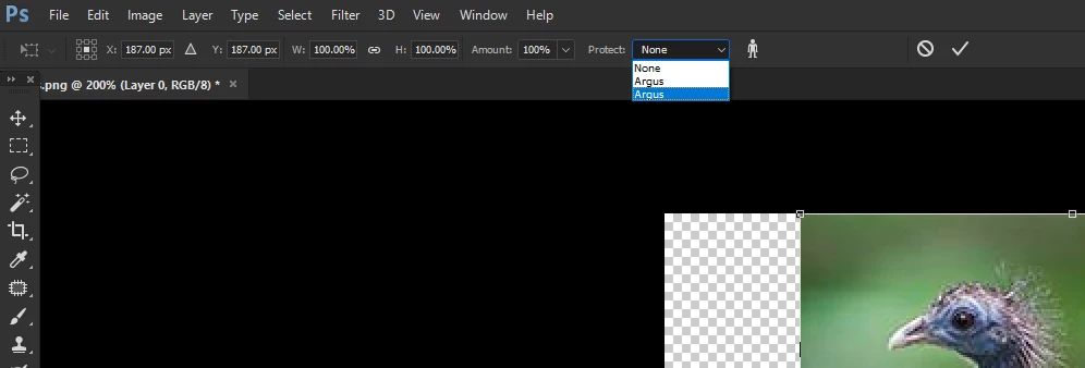 5) In the toolbar go to the combobox 'Protect' and you will see your alpha channel Argus-I did this example twice which is why it is listed twice, but you'll only have it once. The alpha channel protects the Argus during the scaling.