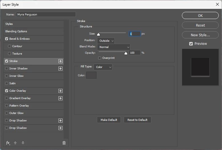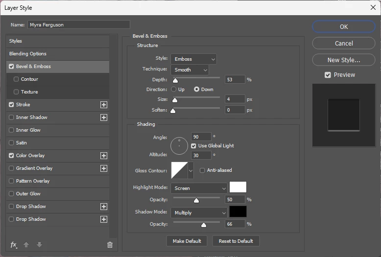 - Bevel & Emboss - click on it to open the Bevel & Emboss options to make adjustments as needed
