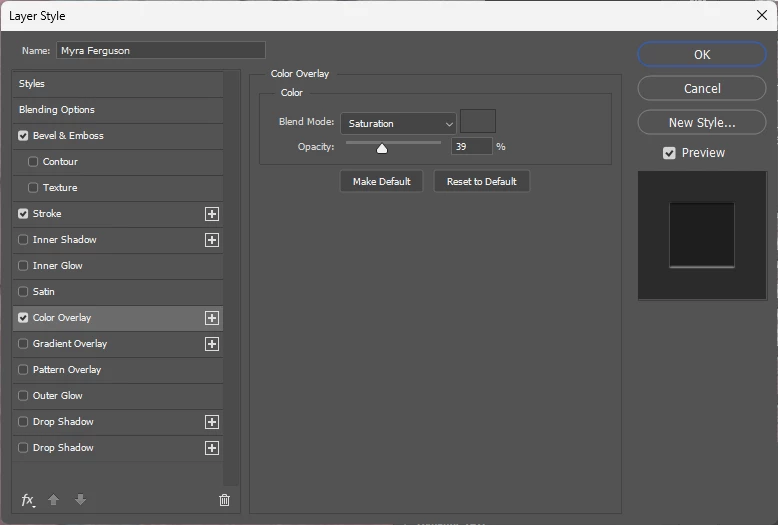 - Add a color overlay with a Saturation blend mode to affect the appearance of the text, if needed