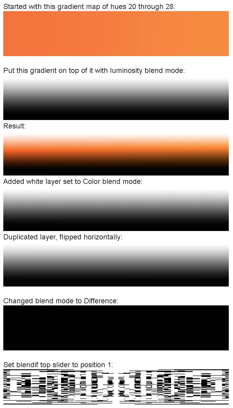 This is weird. Basically, I was testing to see how far apart hues had to be before I could easily see the difference. I started with a horizontal gradient of hues 20 through 28. I put a vertical white to black gradient on top of it with the luminosity blend mode. Then I added a white layer set to color blend mode. I duplicated that layer, flipped it horizontally, and changed the blend mode to Difference. I expected the result to show black in the middle (black shows there was zero difference), lightening on either side as the difference between the layers increased. I wasn't surprised to see all black because there wasn't going to be a whole lot of difference. I used Blendif to double check that the result showed black in the middle. I moved the slider on the left (dark) to the right (light) and it almost immediately went transparent, so I slowly slid the slider (unintentional alliteration) to the left. From positions 255 through 2, everything was transparent. At position 1, an unfamiliar pattern emerged. At position 0, everything was black again.