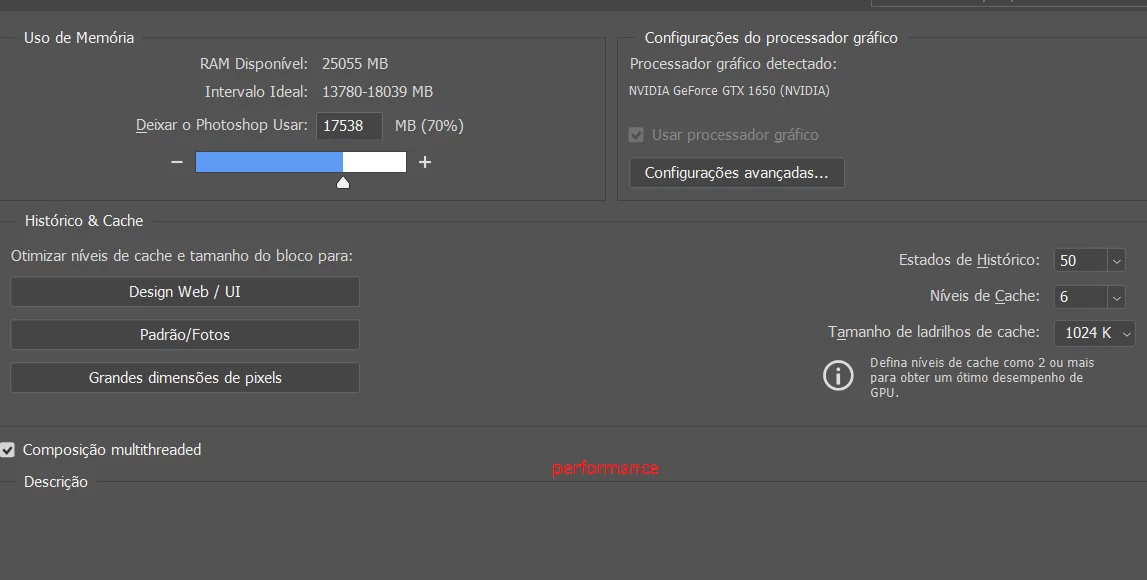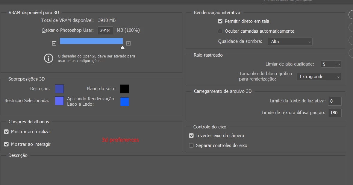My screenshots are in portuguese as it is the main language I use in Photoshop. If you need any translation just let me know. The 3D model file name is the "Totem 3x6 vertical". I am also uploading screenshots of the Performance and 3D preferences.