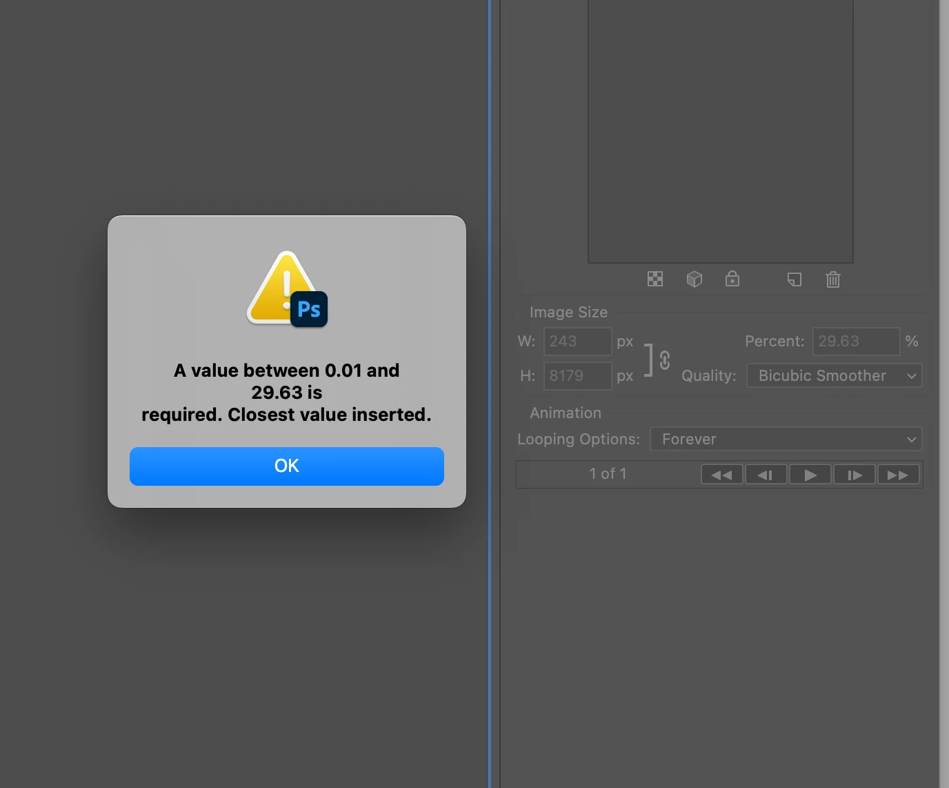 I can save for web 100% ( A value between 00 and 00 is required. closest value inserted.