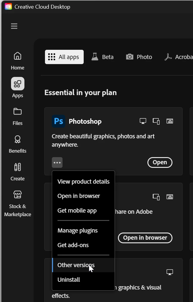 Hello, I can´t install a previous version of Photoshop. When I try it It doesn´t appear de option in the menu.