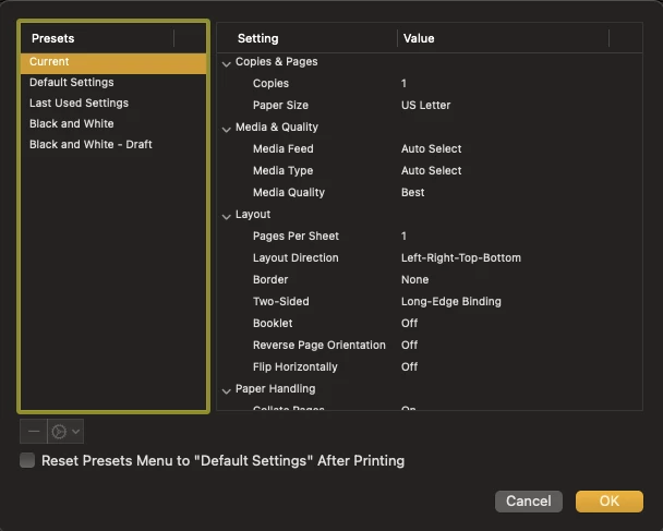 And in Print Settings, I don't have any option to change the color settings or anything like that.