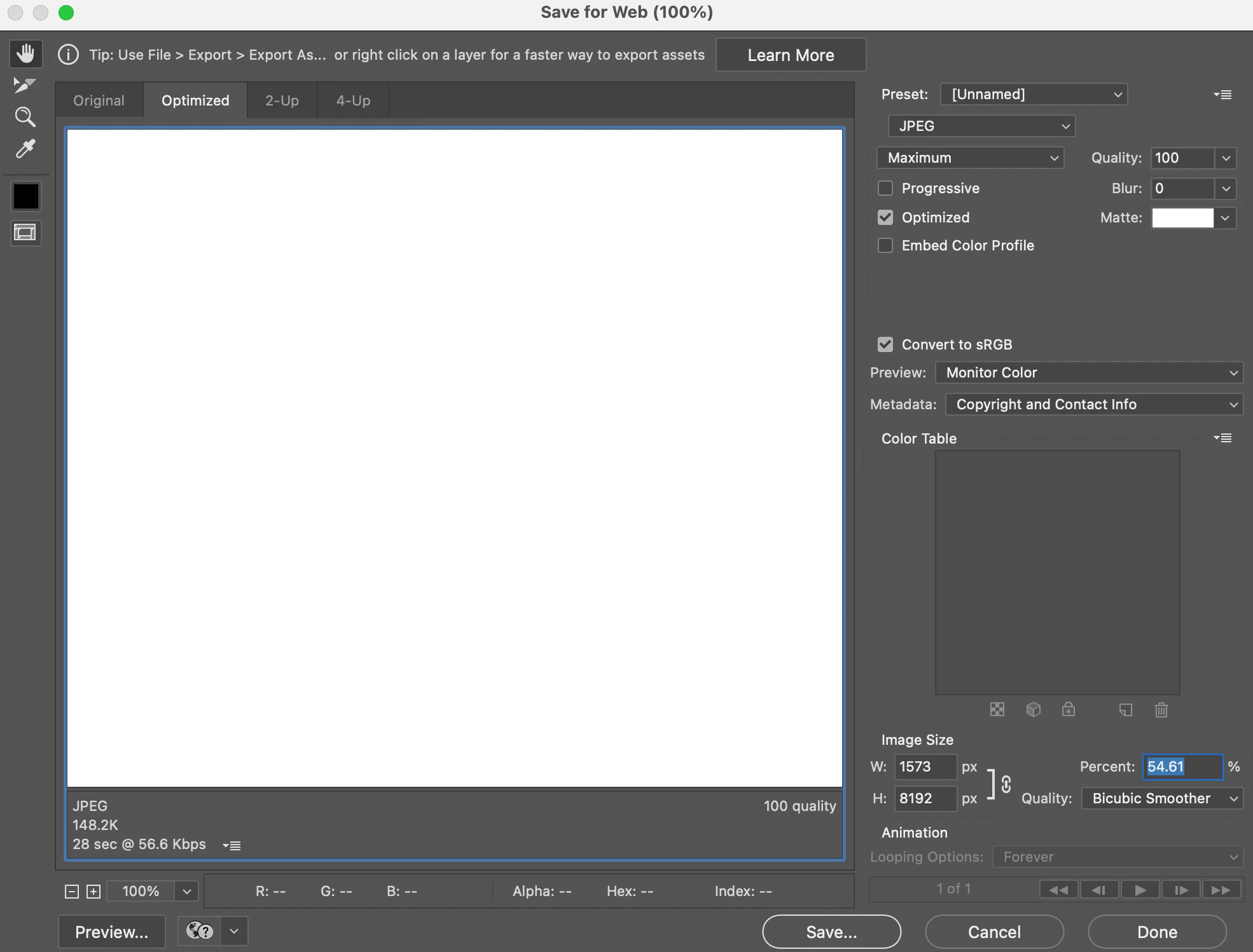 I can't save large/long .psd for web at 100%?