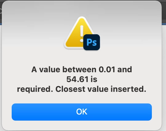 At first I thought this was a problem with my .psb which was cropped from an original file size of 2,880 x 50,000 px at 72dpi. So I made a .psd with the cropped contents and it is still giving me the same problem. When I save either for web (jpeg, png, anything) - it's forcing the literal size/scale down from 100% to some random percentage I didn't input. And I can't for the life of me figure out how to save it at 100% - the software just keeps erroring telling me I need to put in a number between .1 and the arbitrary number they came up with which is currently 54.61 (see screenshots).