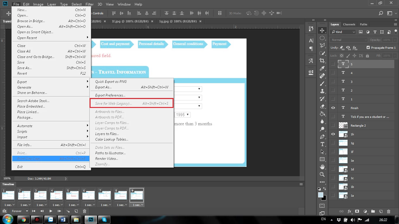 Thanks you so much, when change from 32 bit to 8 bit, i can use Save for Web!!!