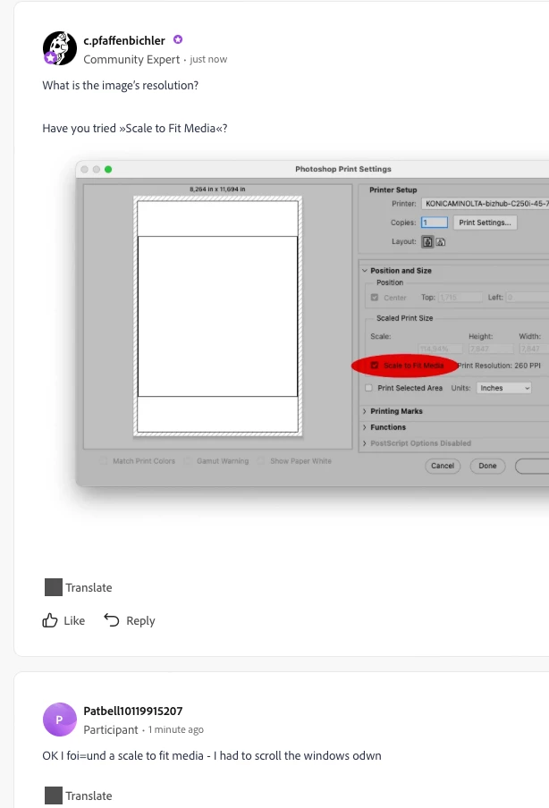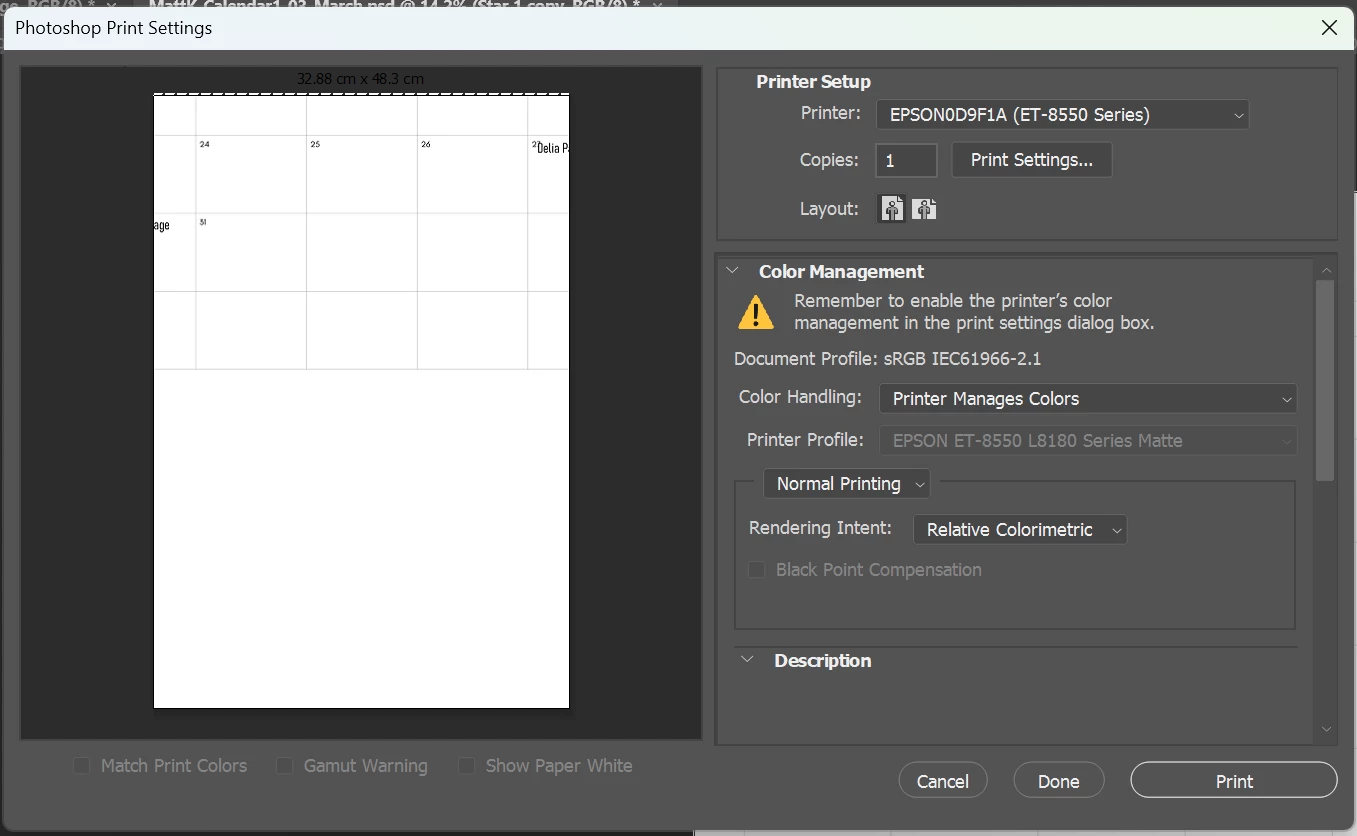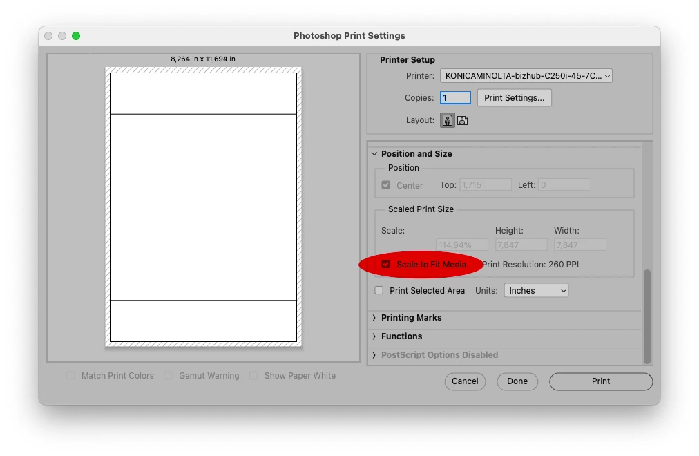 I have a canvas 8000x11412 pixels the image is the same dimensions. When I go to print it doesn’t fit the paper. Which fwiw is A3+. The printer settings say the correct document size and that output paper is the same. I have an earlier closely identical image which previews and prints fine. I think there is some hidden setting I have inadvertently set.
