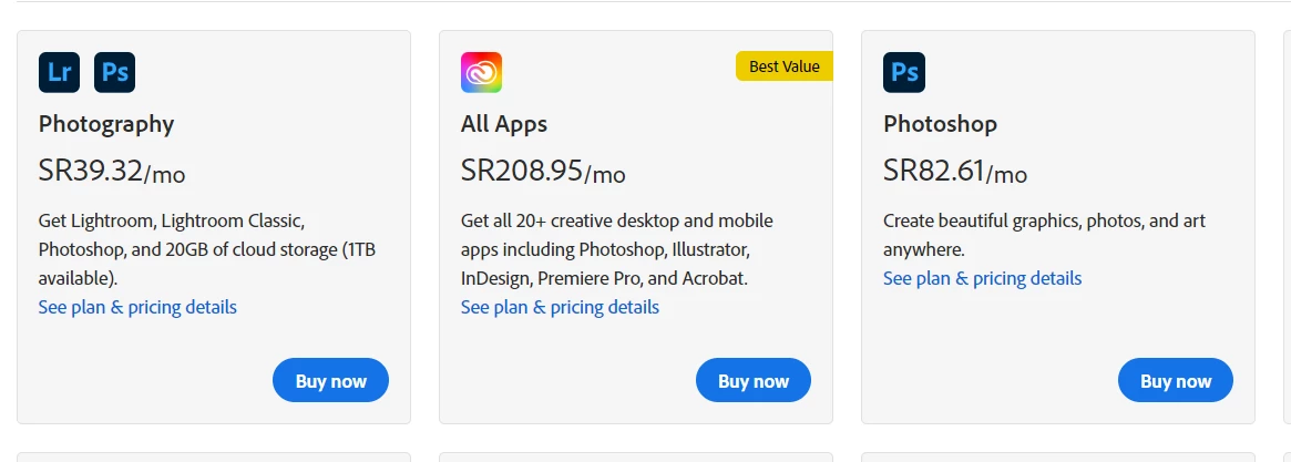I have attached an image of the screen that appears, the prices are very, very different. Apparently, Photography gives both lightroom and photoshop for a low price, whereas if I were to buy any of them individually, they would cost about double as much. Is there a reason behind this? Or are the software provided in each bundle the same? Thanks in advance.