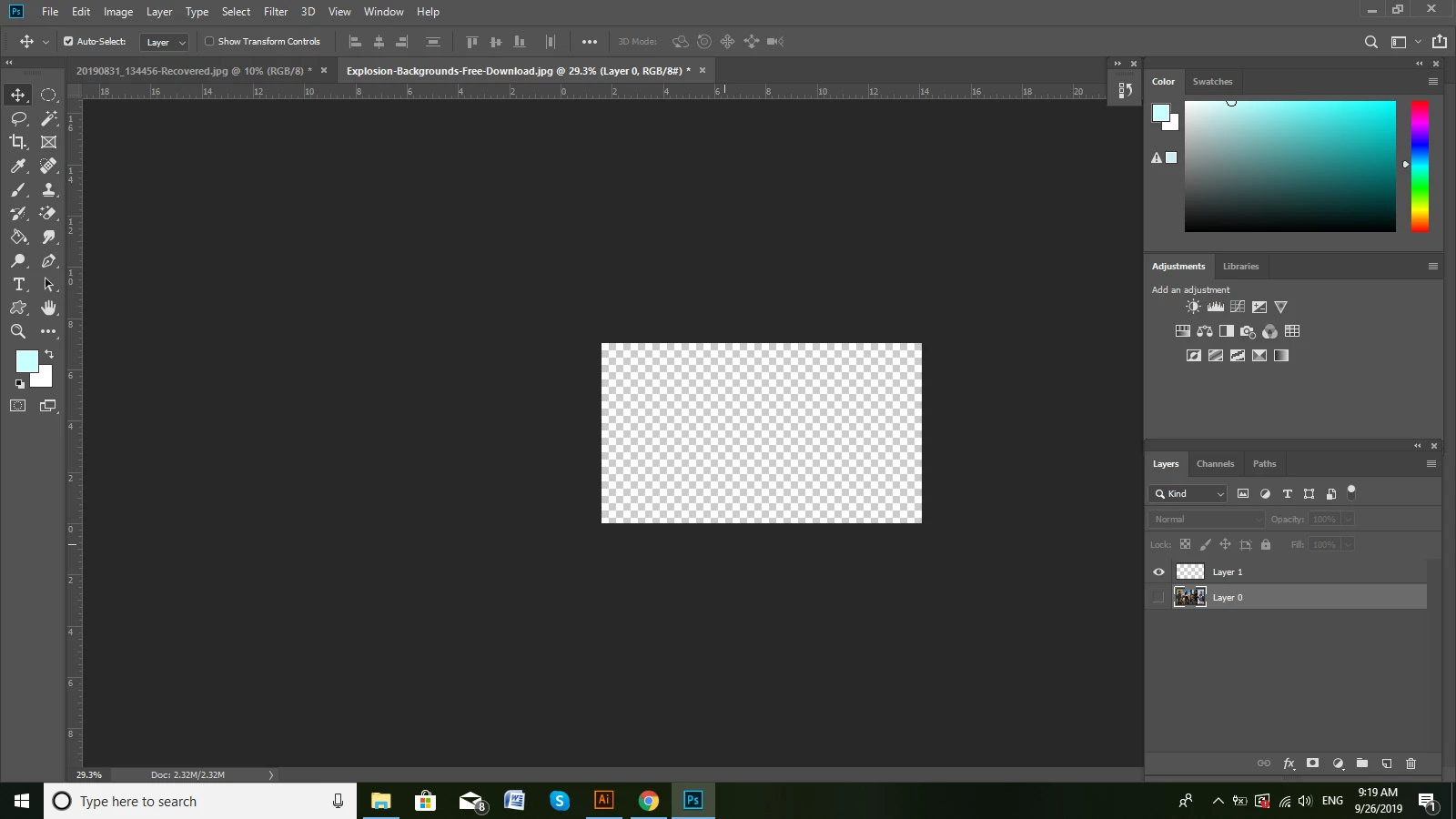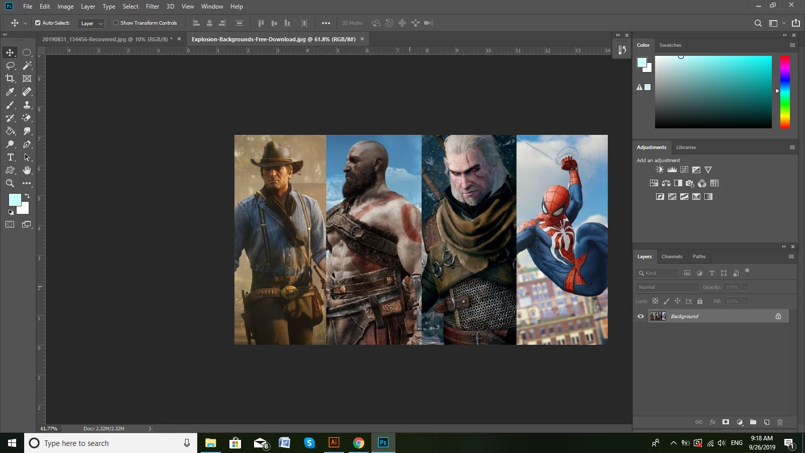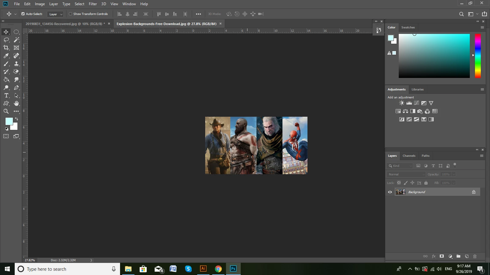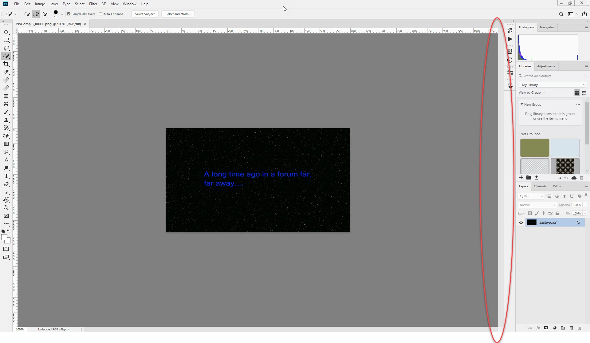 Your image is in the middle of the document window, but you have the document window extended to the right of your screen and have panels over that window. Try moving the right edge of the Window to the left and dock the panels outside of it. The standard Adobe workspaces such as Essentials, Photography work that way as default.