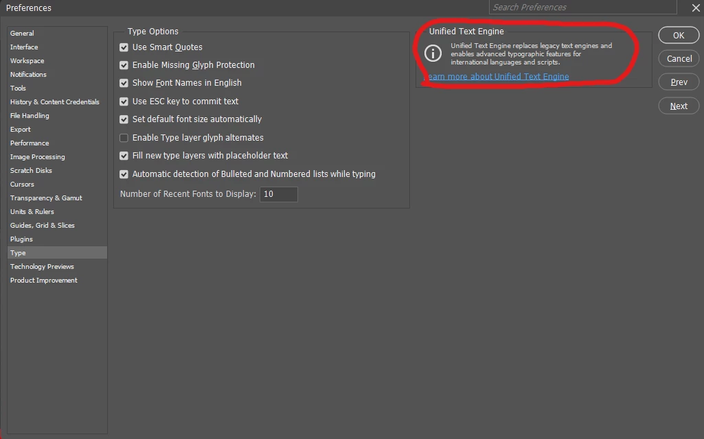 I tried changing the settings in the Unified Text Engine section, However, the editing options do not appear and the following text is displayed: “Unified Text Engine replaces legacy text engines and enables advanced typographic features for international languages and scripts”