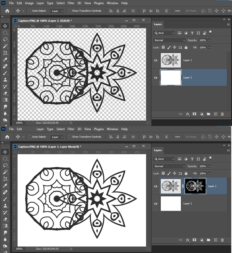 When it's all done, this is what my kid wants it to look like--Two shapes filled with a white background so you can't see the image in the back through the image in the front. We can do this by following all the steps I outlined above, but I was hoping for a faster solution.