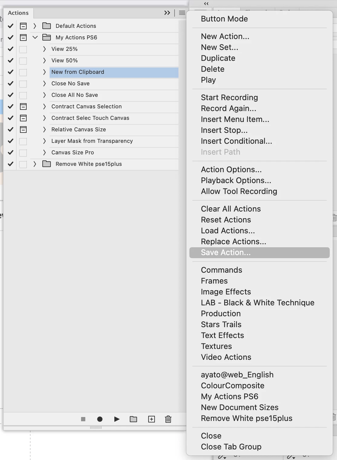 • if you created the actions, then they are not saved as an ATN file unless you follow Jeff's instructions to save them. Your screenshot shows that you found the correct location to display..