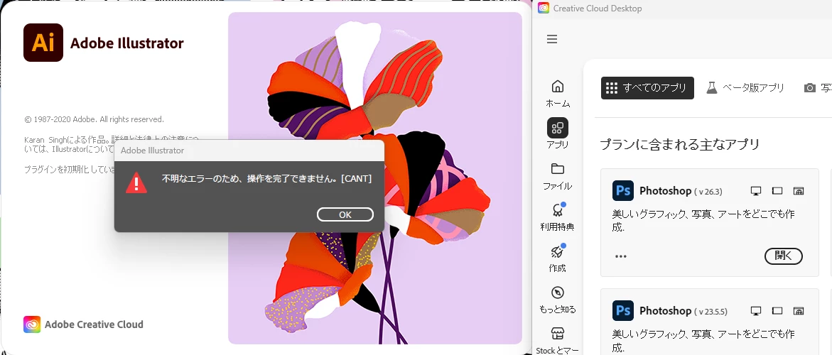 The problem only arises in environments where Photoshop 2025 (v26.1) or later is installed. In such cases, only Illustrator 2020 (v24) displays an error upon startup: “an unknown error [CANT]”.