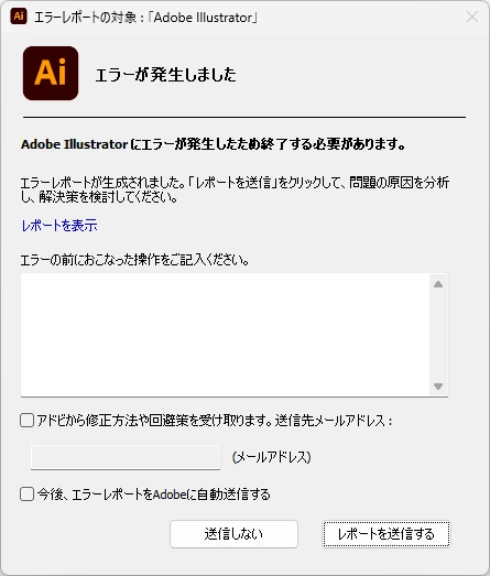 またIllustrator終了時にクラッシュレポートが表示されます。
