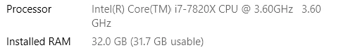 My specs are: Win 10 Pro 64 bit, 32GB RAM Intel i5-9400F CPU. Nvidia GTX1650 graphics card.