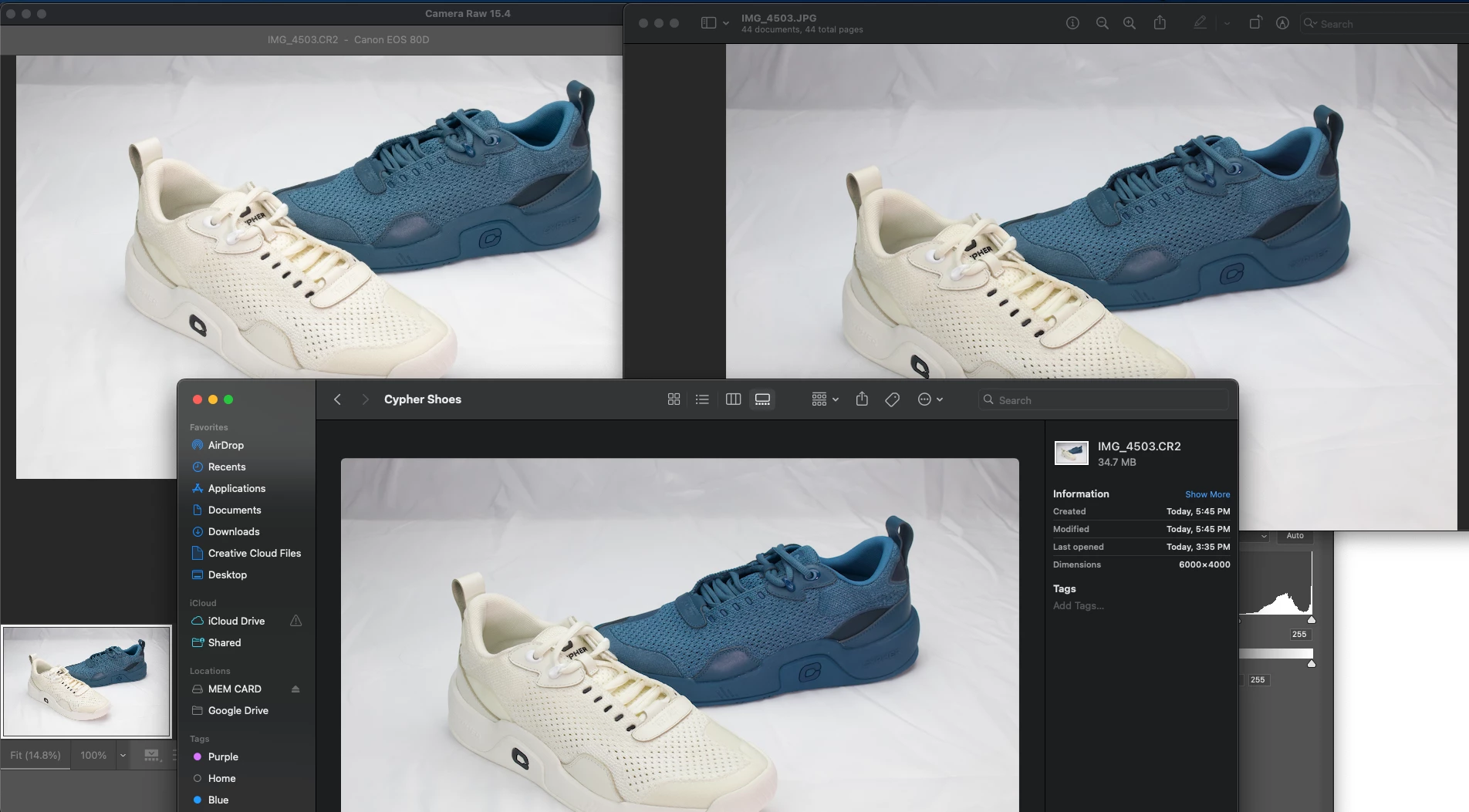 I was shooting shoes today, and I edited the first picture I took this way, and it worked fine. After that, I took more pictures (I didn't change any camera settings or photoshop settings) later, I go to edit the photos, and this started happening. You can see the JPG looks good, and the CR2 (RAW) looks good in the file preview, but when I open the image, it completely changes and gets all washed out and super bright.