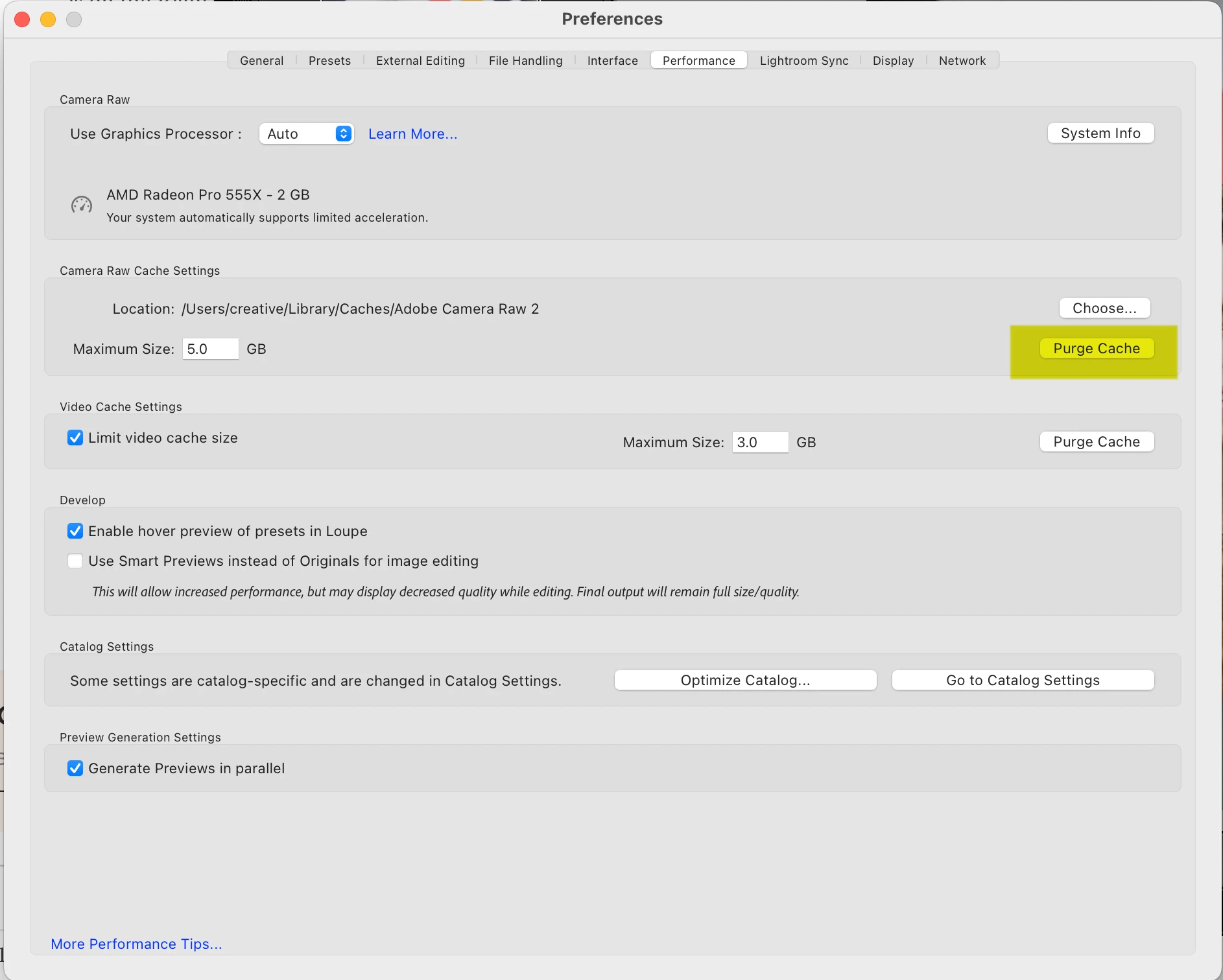 I've included screenshots to show where the icon is and where the sections are within the Camera Raw Preferences.