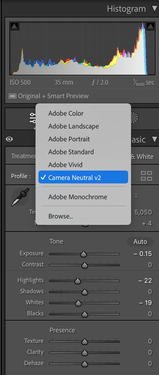 I checked my camera settings = sRGB, then I tried going into lightroom to "Profile" - "Browse" - and switched to "Camera Matching" there are options available there, the result seems better but still not great...