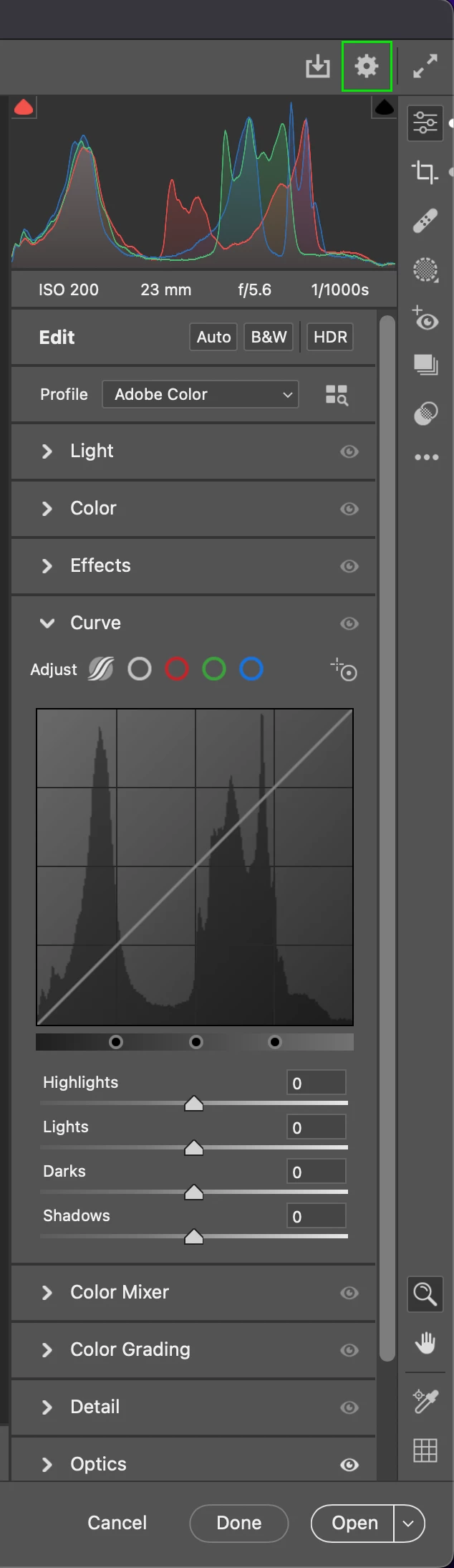 1. Opening in camera raw does not match the camera preview.
