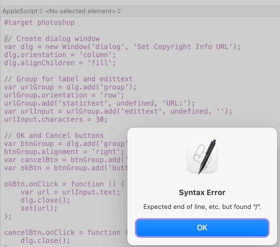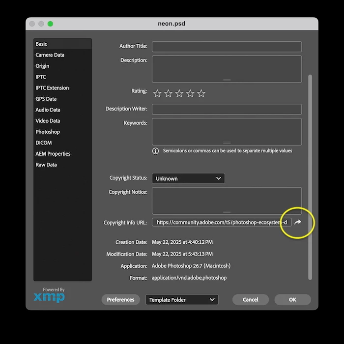 I am having a hard time adding a creator URL to the "Copyright Info URL" field in Photoshop's image info panel