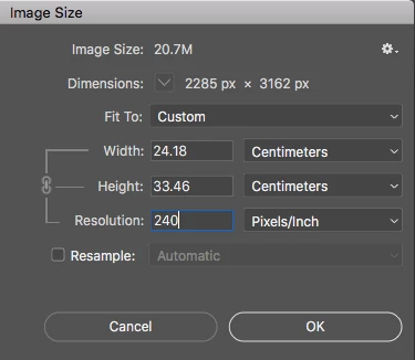 After I chose the images I need, I open them and crop them at 305/403 mm, the resolution setting is 300 dpi , it appears right next to the Height/Width.