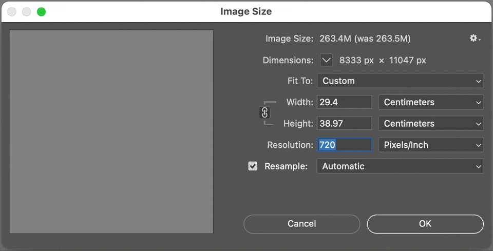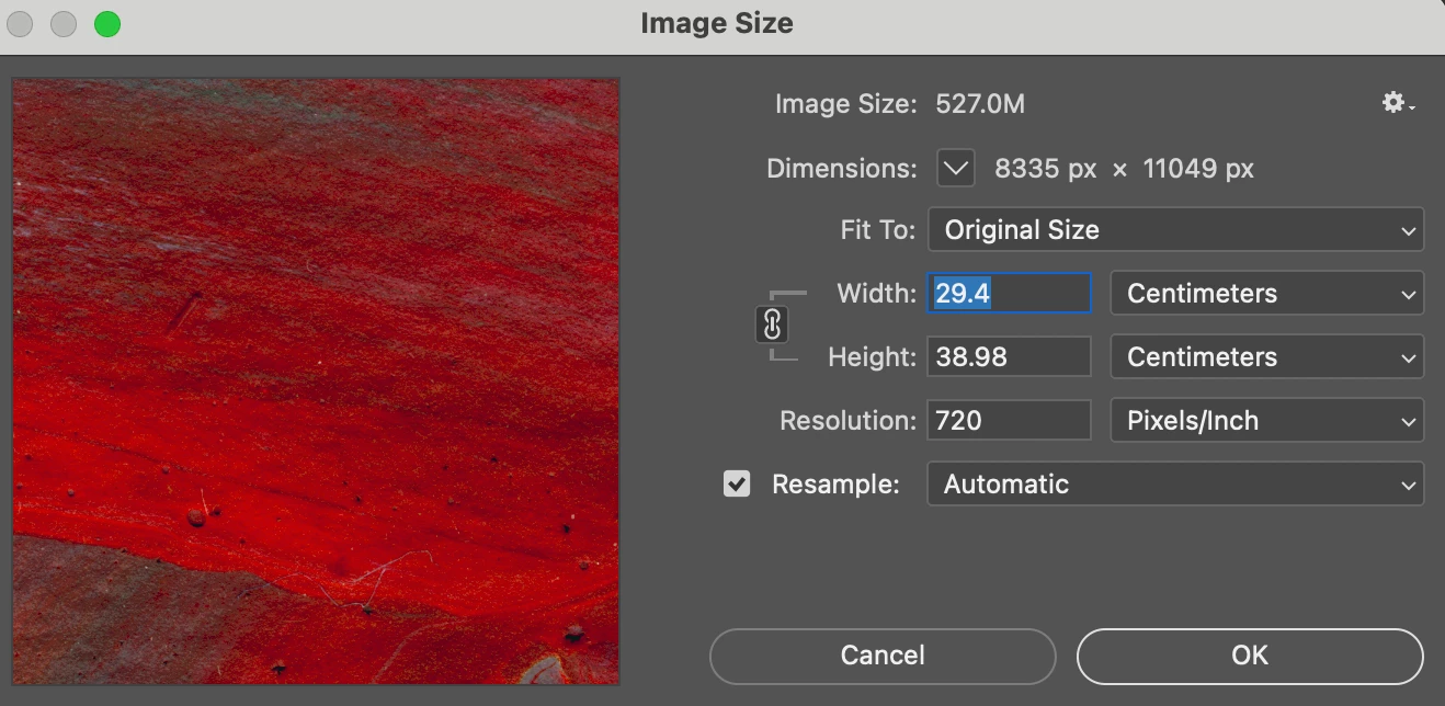 Hi All. I have a scan of some artwork that was scanned at 720 dpi. The scanned image shows in Photoshop is 29 x 40 cm (same size as the original physical artwork on paper). In photoshop I want to change the dpi to 300, and then I want to increase the dimensions of the image. When I do that, how do I know when the height x width is too large, in terms of the image losing quality. Maybe another way to ask the quetion is: How do I know at what dimensions the 300 dpi no longer be true? Screenshot of the Photoshop dialogue box image size attached.