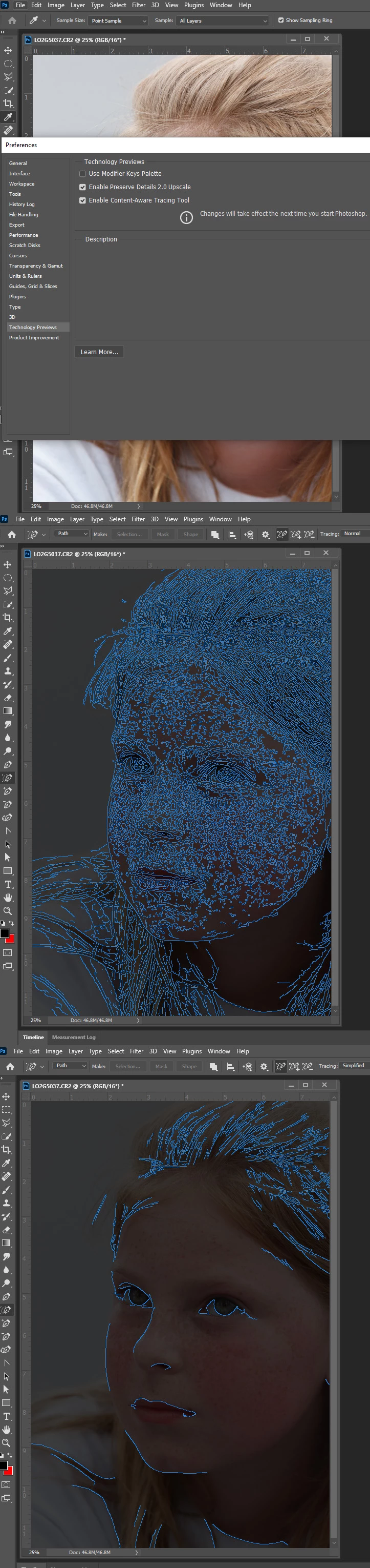 The new tracing pen is experimental and requires a supported GPU,   preference enabled, a toolbar reset and a restart of Photoshop.  You have to realise it will never be able to trace a raster image.  It simplified option will miss a lot of detail and the normal and detail option will have too many paths to be useful.   Perhaps the tool will be useful for some image content when Adobe improve it. Also on my machine it seem to have a nasty bug in 22, Once it bites all feature in Photoshop performance goes to pot. There is so much lag I need to restart Photoshop to restore Photoshop performance. Currently you do want it.