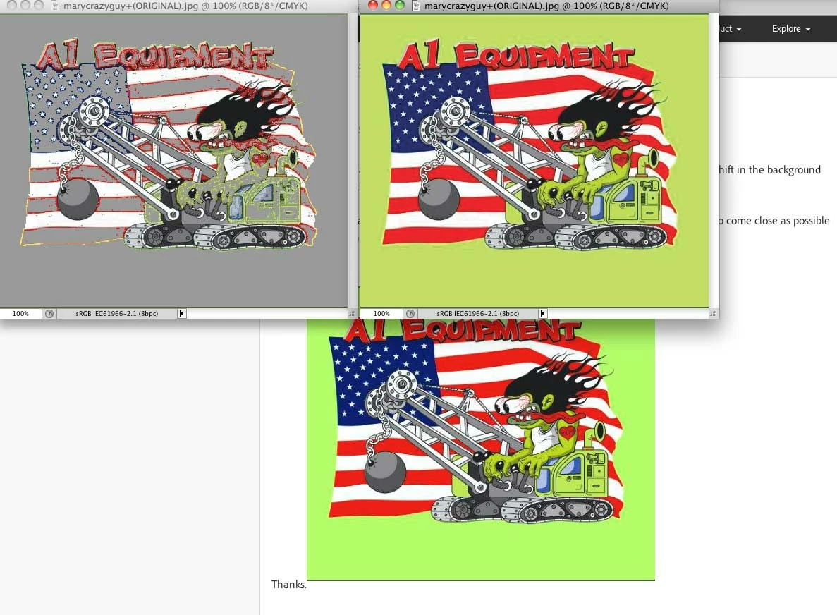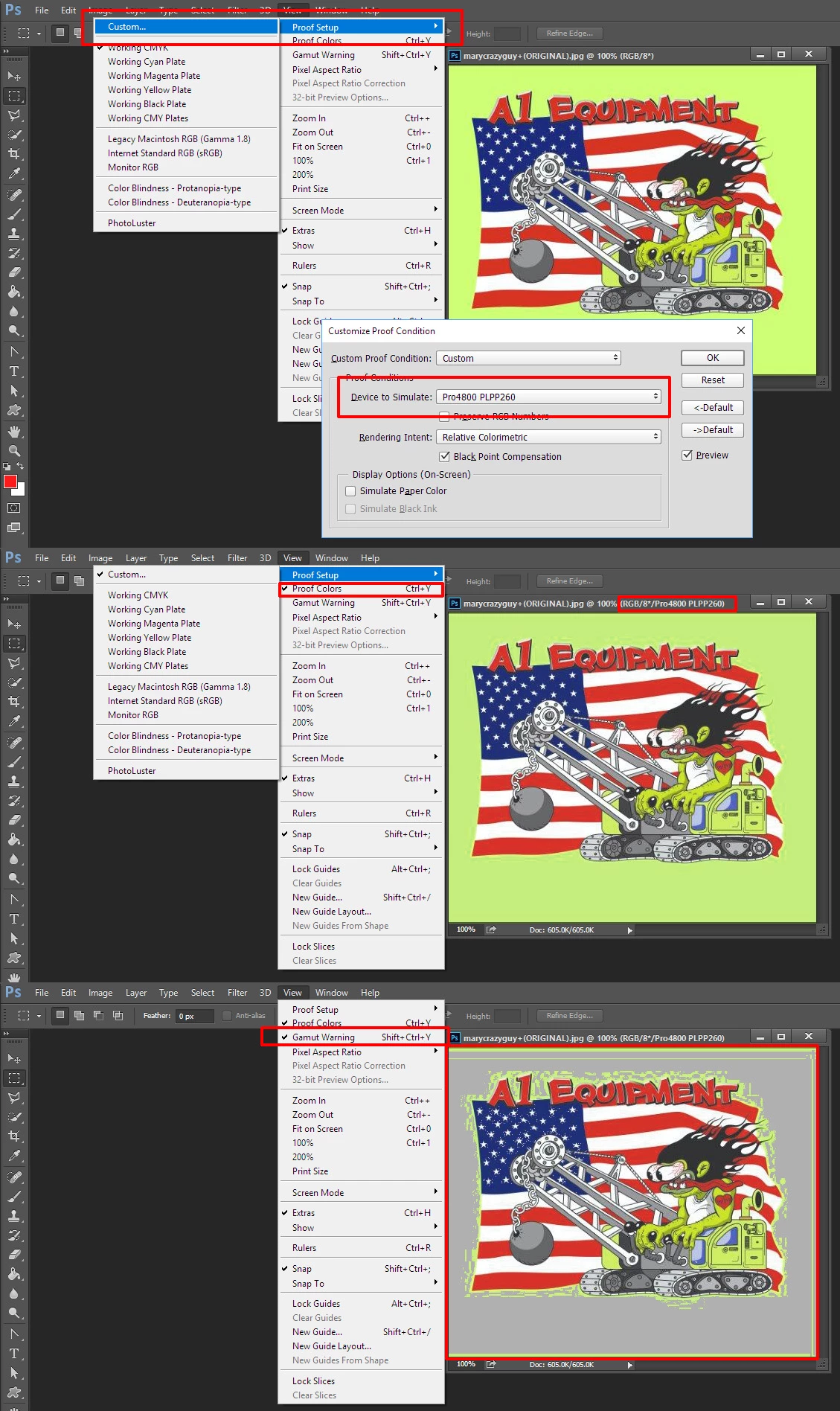 On the left is the image with Gamut Warning tuned on. Everything that is gray is out of gamut, even the red & blue of the flag.