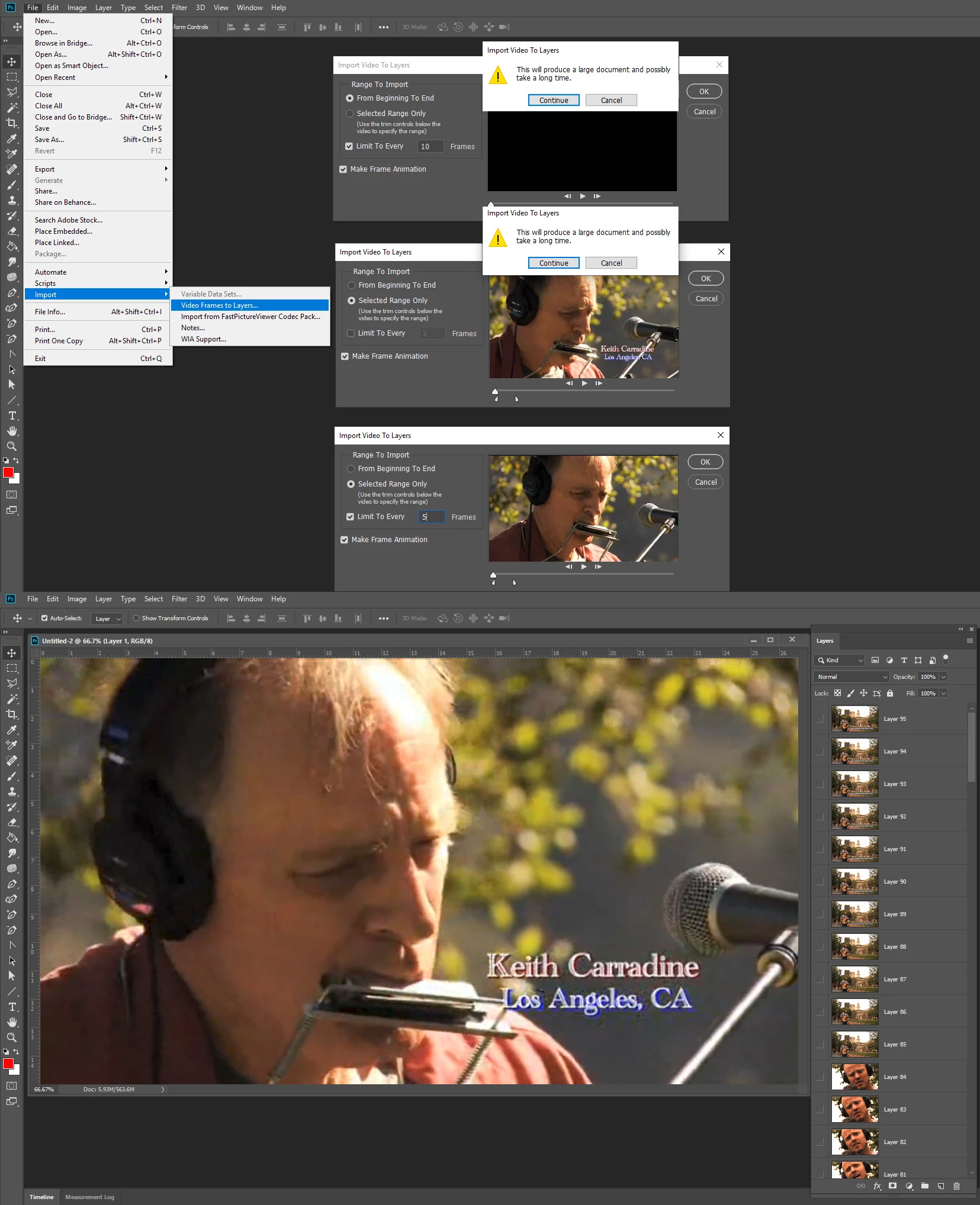 Good afternoon. I've been having an issue with Photoshop CC in terms of creating .gifs: As the title says, I cannot properly import clips without them freezing; the preview where you choose to cut shows only a static image or other times only a few frames of the clip before freezing. This persists if I proceed with importing it; it will show up on the timeline just as it was portrayed while importing.